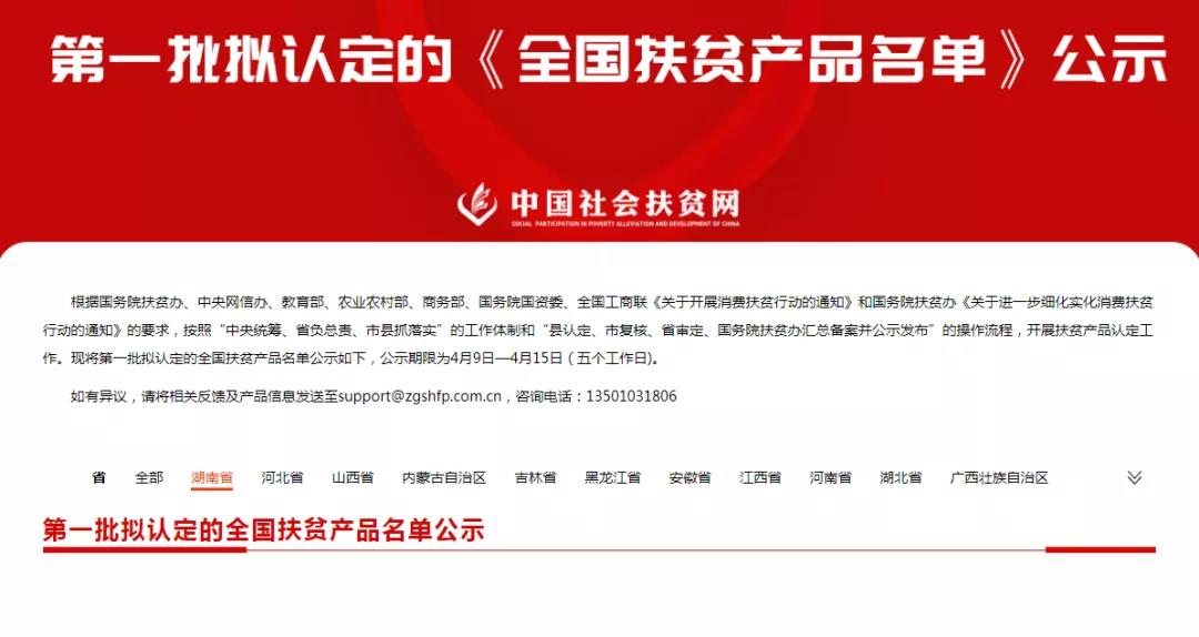 邵阳新闻网4月16日讯 日前,中国社会扶贫网公布了第一批拟认定的《全国扶贫产品名单》(详见https://consume.zgshfp.com.cn/formula)。第一批拟认定的全国扶贫产品覆盖区域为:河北省、山西省、内蒙古自治区、吉林省、黑龙江省、安徽省、江西省、河南省、湖北省、湖南省、广西壮族自治区、海南省、重庆市、四川省、贵州省、云南省、西藏自治区、陕西省、甘肃省、青海省、宁夏回族自治区和新疆维吾尔自治区。